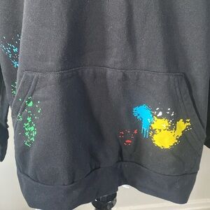 Disney Mickey Mouse Splatter Paint Black Hoodie. Primary color splatter. Embroidered lettering. From Box Lunch. Sz XL. Worn maybe twice. Very nice condition.