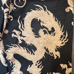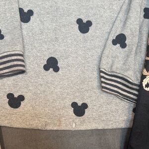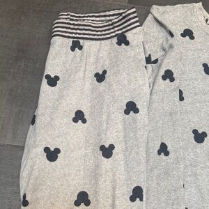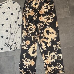 Charming Disney pajama set with gray top and pants featuring Mickey Mouse silhouettes. There was a drawstring at bottom of shirt that is gone. Silky Dragon PJ bottoms never worn.