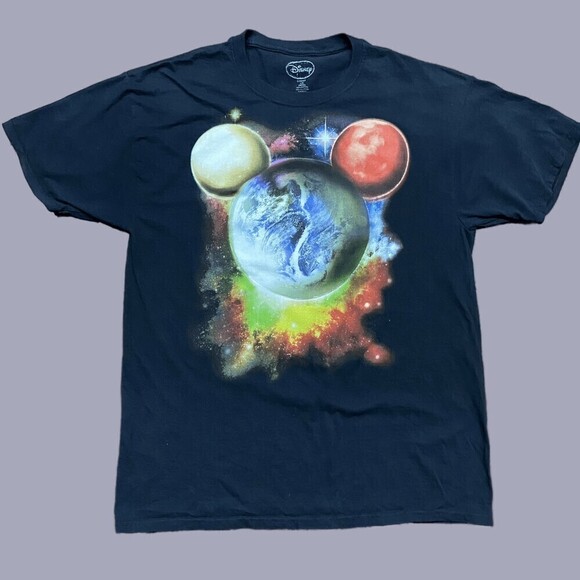 Show your love for Mickey Mouse and the universe with this men's size large Disney tee. Constructed from soft cotton, this graphic t-shirt is pre-owned in excellent condition. Make this unique addition to your wardrobe today.