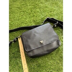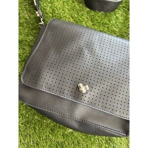 The Disney Mickey Mouse Purse is a stylish and practical crossbody bag in black, featuring the iconic Mickey Mouse character. The medium-sized purse is made of polyester with a coated finish, accented with studded details and a strap accent. The adjustable crossbody strap is suitable for women and the lining is made of canvas. This retired purse is a must-have for Disney fans, perfect for adding a touch of magic to any outfit.