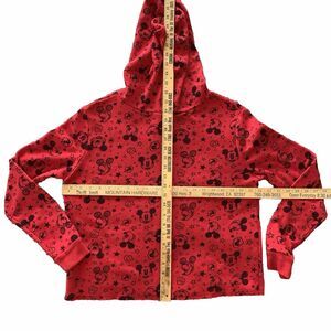 Show off your love for Disney and Mickey Mouse with this cozy red pull over hoodie. The all-over print features the iconic character and is made of a soft and comfortable rayon and polyester blend fabric. The long sleeves and hood make it perfect for colder seasons and it's great for activities like walking or driving. The hooded, full zip design and pullover closure add a touch of convenience and style. This hoodie is a must-have for any Disney fan and is available in a size small.