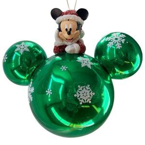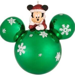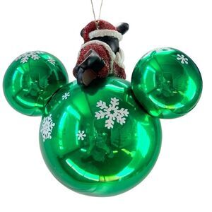 Disney Mickey Mouse Ears Santa Snowflakes Red & Green Festive Decorative Collectible Holiday Hanging Christmas Tree Glass Ornament.