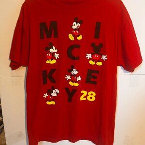 Celebrate the timeless charm of Mickey Mouse with this vibrant red Disney graphic tee, featuring multiple playful poses of the iconic character. The design spells out “MICKEY” in bold black letters, accented by the number 28 in yellow—a nod to Mickey’s 1928 debut.