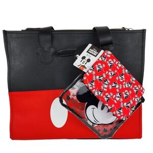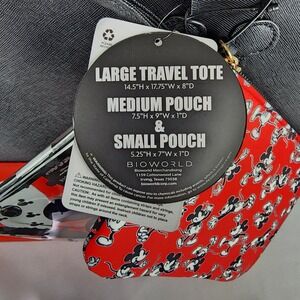 Rare find! This Disney Mickey Mouse Three Piece Travel Tote Bag Set features a Large Travel Tote with Mickey Head styling, a clear Medium Pouch with Mickey Head graphic, and a small red pouch with all-over Mickey print.