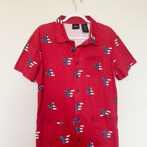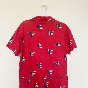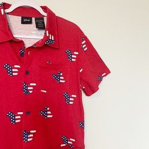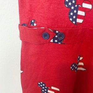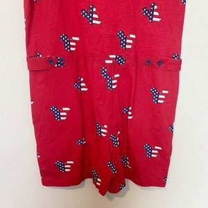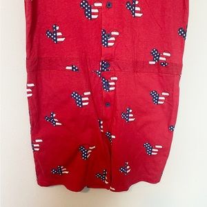 Disney American Flag Americana Mickey Mouse Print Unisex Romper Red Size Large. The cutest piece, perfect for summer! Short sleeve romper with collar, button front close, finishes in relaxed fit shorts. Single front patch pocket. Adjustable tab detail at waist (you can cinch the waist in a bit or not). Red color with all over Mickey silhouette in American flag/stars and stripes print. 100% cotton.