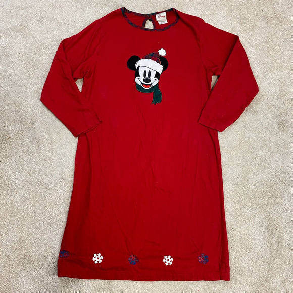 Red long sleeve nightgown/sleep shirt with embroidered winter themed Mickey on front and snowflakes on hem. Some loose threading on Mickey but good preworn condition.