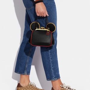 In a special collection, Coach collaborates with Disney and the Keith Haring Studio to celebrate the iconic artist's playfully subversive illustrations of the one and only Mickey Mouse. Inspired by kisslock closures on vintage coin purses, the Kisslock Frame bag is based on the "Cashin Carry" from 1969, a top-handle style designed by Coach's first lead designer, Bonnie Cashin. Crafted of our glovetanned leather, this structured silhouette features a looped top handle and dimensional Mickey Mouse ears. It easily converts to a crossbody with a removable chain strap for hands-free wear.