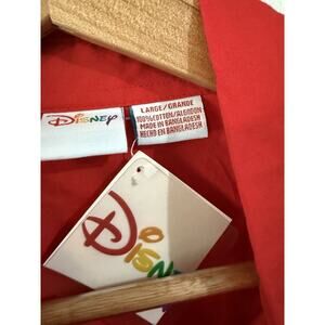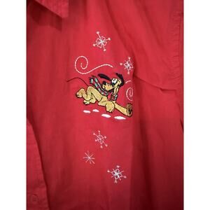 This product is a brand new Disney Mickey & Pluto Christmas long sleeve button up shirt in size Large, featuring a festive red color that is perfect for the holiday season. The shirt is part of the Disney franchise and is suitable for women. It includes the iconic Disney characters Mickey and Pluto, making it a must-have collectible for Disney fans and enthusiasts. The shirt is adorned with the Disney brand logo and tags, ensuring its authenticity and quality.