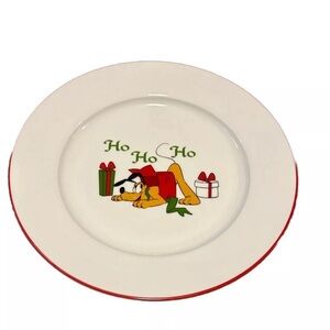 This vintage set of three dinner plates features the beloved Disney characters of Mickey, Pluto, and Goofy in their festive holiday attire. The plates are perfect for any Disney fan or collector, with the iconic “Ho Ho Ho” caption and red rim add a touch of holiday cheer to any dining experience. Made with high-quality materials, these plates are durable and long-lasting, making them ideal for everyday use or special occasions. Add a touch of Disney magic to your dining table with this charming set of plates.