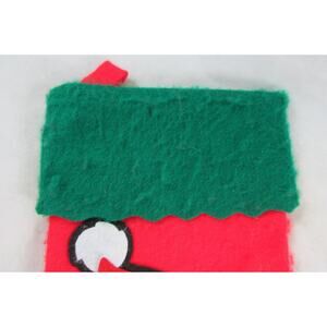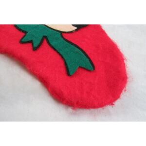 Bright, clean 18" plush Christmas stocking decorated with an applique of Mickey Mouse wearing a Santa hat and scarf. It has a hanging loop attached at the top.