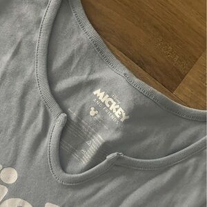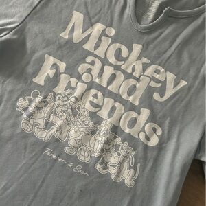 A soft, long-sleeve blue shirt featuring Disney’s iconic “Mickey and Friends” graphic design. The shirt includes characters like Mickey, Minnie, Donald, Daisy, Goofy, and Pluto, with the text “Forever & Ever” beneath the illustration. Perfect for Disney lovers!