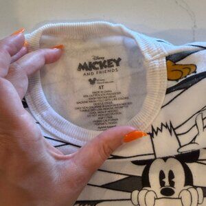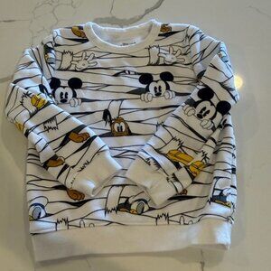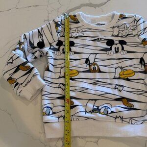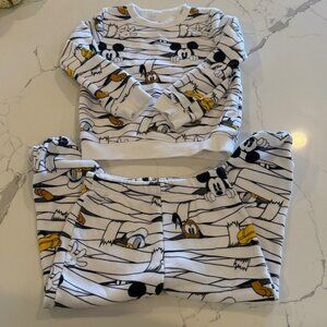 Adorable Disney pajama set with Mickey and friends in mummy wraps. Features a playful design on a white base with black and yellow details.