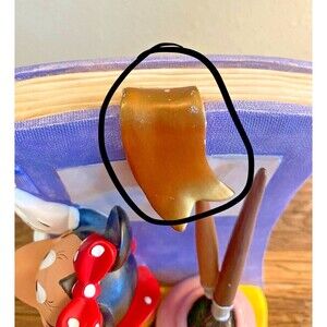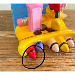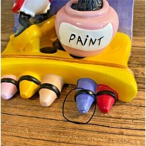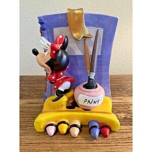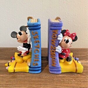 Used item. There are some imperfection spots noted in the photos. The paint brush, ribbon on top of Minnie's bookend blue crayon on Minnie's bookend, and red crayon on Mickey's bookend. There is writing on the bottom of both bookends
