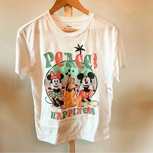 Disney Mickey and Minnie Mouse embroidered patch tee with short sleeves in size XS. The crewneck T-shirt features colorful embroideries and prints of Mickey, Minnie, and Pluto.
