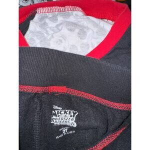 This outfit features Mickey Mouse on the front and back of the long sleeve shirt. The pants have red stitching and Mickey head on the knees for extra durability.