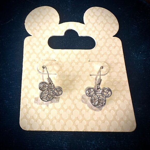 Delicate silver-tone dangle earrings shaped in Mickey’s iconic silhouette, featuring an ornate swirling filigree pattern that sparkles softly with every movement — a charming touch of Disney elegance perfect for everyday magic.