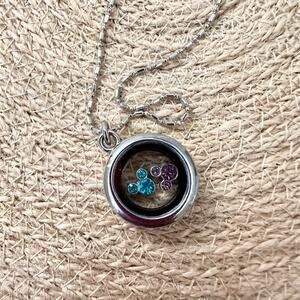 Unmarked. Silver tone thin chain necklace with large round clear locket pendant. Magnetic closure on pendant. Contains one blue rhinestone Mickey silhouette and one purple Minnie silhouette. Preowned.