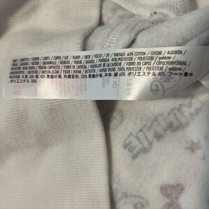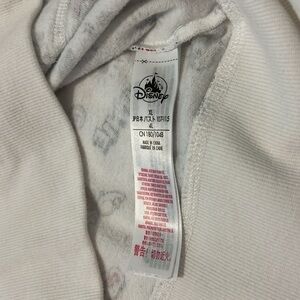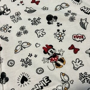 Minnie makes her mark all over this fun zip hoodie. Bows, hearts, Minnie figures, Minnie icons, and ''Cute'' phrases are among the designs on the allover print inspired by the fa-mouse fashionista. The fleece fabrication interior and broad ribbed hem and cuffs help to make this a stylish stand out Body: 60% cotton / 40% polyester Hood lining: polyester Sleeve cuffs: 57% cotton / 38% polyester / 5% elastane
