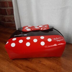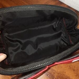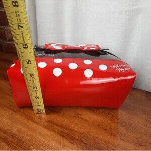 Adorable Minnie Mouse cosmetic case by Disney from "The Cream Shop collection". This case features a playful black and red polka dot design with the Iconic Minnie Mouse ears. This bag features black patent leather and a red and white polka-dot design. It is a zip around style with a silky nylon fabric lining that is spotless.