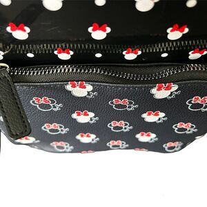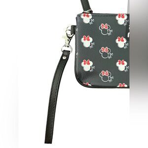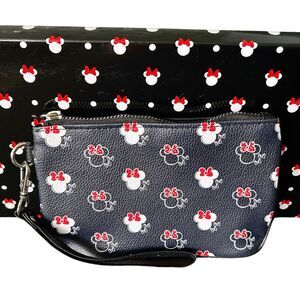 Disney Minnie Mouse ears patterned canvas wristlet. Has gunmetal tone silver zipper with black pull. Lobster clasp wristlet strap that can be removed. Easy to clean.