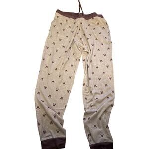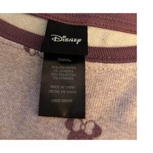 Disney Minnie Mouse Cozy Pajama Set, Purple Brushed Knit, Women's Large. This Disney pajama top and pants features an allover print of Minnie Mouse heads in a dark plum shade on a light lavender-gray background. The long-sleeve design includes contrast ribbed cuffs and neckline in a matching plum color. Made from a soft knit fabric, it offers cozy comfort perfect for lounging or bedtime. A fun and subtle take on classic Disney style, ideal for Disney fans of all ages. Excellent condition.