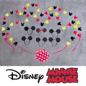 Set includes two 12 foot long die cut garlands, 15 red & white polka dot paper napkins, 6 Minnie Mouse ears (one is glittery with red sequin bow for the birthday girl.
