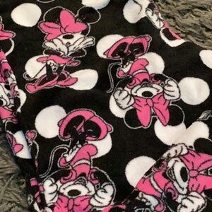 Soft fleece pants with Minnie Mouse design. Features black, pink, and white colors. Perfect for lounging.