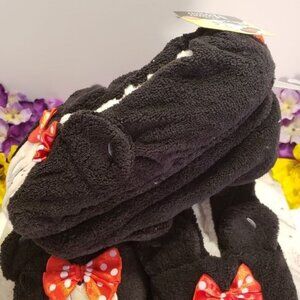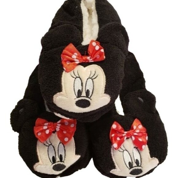 Disney Themed Minnie Mouse Black Fuzzy Slippers with Red Bow