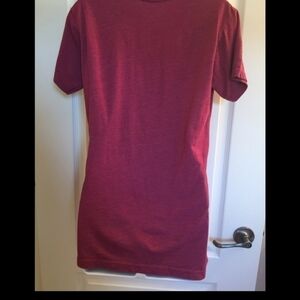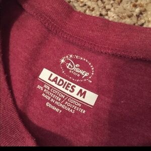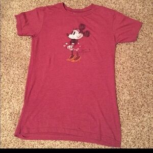 Gently used berry colored distressed graphic of Minnie with her autograph. One area of inside bottom hem is loose but doesn't affect wear and can't be seen when wearing.