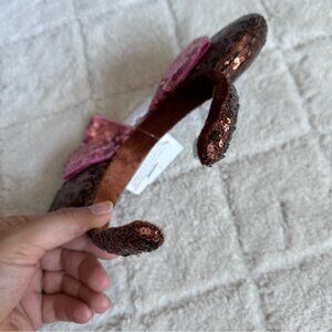 Details: You'll look deliciously cute in this Minnie Mouse Ear Headband. Fashioned in sparkling sequins, it's inspired by the iconic ice cream bars found at the Parks, complete with a fun bite-sized chunk out of one ear, and topped with a pink bow. Soft padded, sequined Mouse ears. Fabric covered headband with sequined exterior and velveteen non-slip interior. Bite out of right ear.