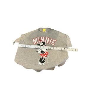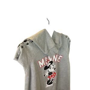 Disney Minnie Mouse lace-up shoulder sweatshirt in heather gray, youth girls size 11/13. This Disney Minnie Mouse sweatshirt features a bold classic Minnie graphic on the front with red polka dot skirt detail and arched Minnie lettering for a timeless Disney look.
