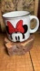 Charming Disney mug featuring Minnie Mouse. Adorned with a vibrant red bow. It is a ceramic mug that looks like an old speckled enamelware cup.