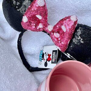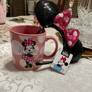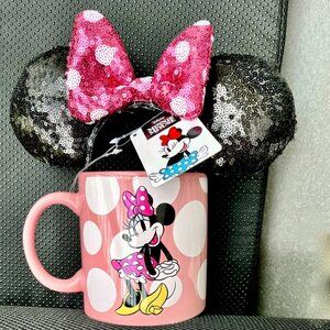 Charming Minnie Mouse mug and headband set perfect for any Disney fan. This new set includes a pink mug with distinct white polka dots and a matching headband featuring black sequined ears and a pink polka dot bow.