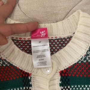Cozy knit sweater with festive green and red pattern. Features Disney branding.