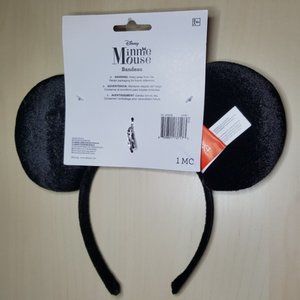 Ear-dorable mouse headband and red satin bow. Wire frames hold the matte black Minnie Mouse Ears upright and anchor them to a plush headband. Top and center, a red Minnie Mouse bow with white polka dots.