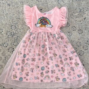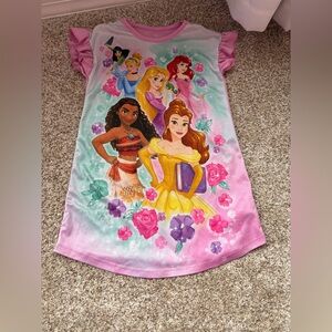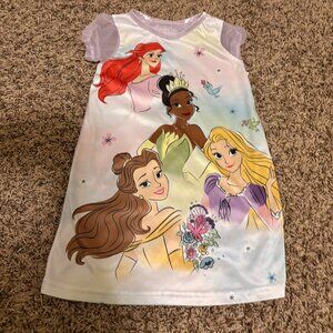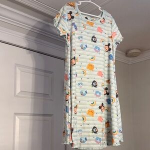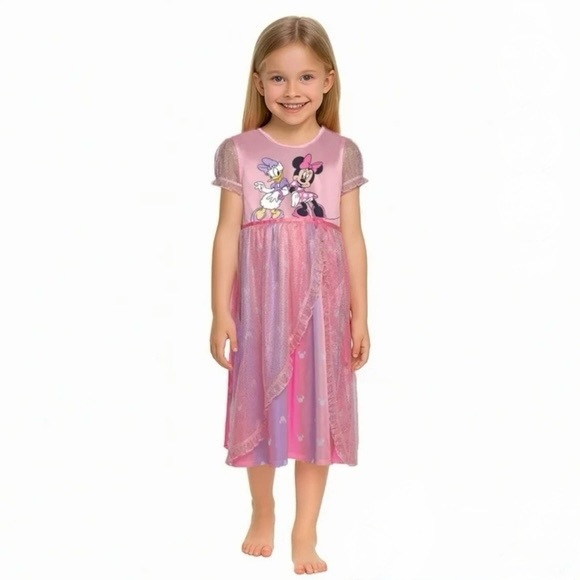 This adorable nightgown features a charmingand colorful graphic of Minnie and Daisy on a lovely pink satin bodice! It has a comfy, rounded neckline and short sleeves made of shimmery tulle. The waistline is adorned with a pretty satin strip and a cute accent bow, adding an extra sprinkle of charm. The skirt is a delightful pink and lavender ombre, decorated with fun icons, and topped off with a shimmery, ruffled tulle overlay, perfect for twirling around. Minnie and Daisy are sure to make bedtime extra special!
