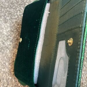 Disney Minnie Mouse Wristlet Dark Green Sparkle with Darker Green Velvet Box. Zipper pocket on back. 5 card slot pockets with 2 larger slot pockets behind them. Large phone pocket. Snap closure. Wallet measures 6 1/2” x 3 3/4” add 1/2” where ears are. NWT