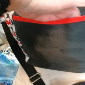 This is an adorable Minnie Mouse diaper bag it's of course in the black red and white it's got the cute little Minnie Mouse on the front left corner. The front is black with a red lining and a big pocket the back is also the same without Minnie Mouse on it the two sides are black with white circles with red bows really cute. Inside is like brand new. It's in a gray color with a big zipper pocket , a key finder , and all your bottle slots and your diaper holder. The bottom is just black there are no rips tears nothing it's in really excellent condition from the Disney baby. It measures approximately 15" wide 10" high 8" depth.