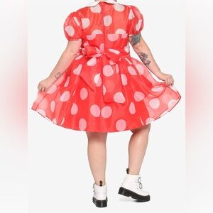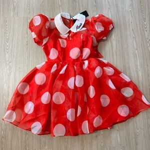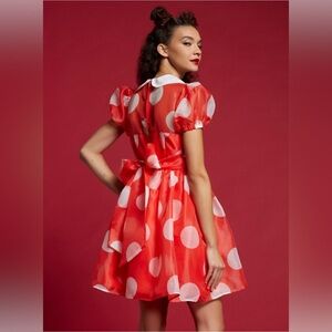 The perfect choice for your next Disney-bounding adventure! Pair cuteness and elegance with this totally adorable Minnie Mouse dress. Red and white polka dot dress features puffed elasticated sleeves, collar embroidered with Minnie Mouse's name, flared skirt and top button closure.