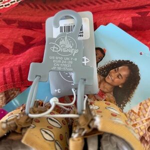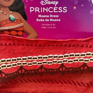 Disney Moana costume and sandals. Features vibrant red top with intricate patterns. Skirt in warm brown tones. Perfect for Halloween adventures.