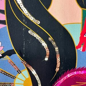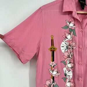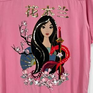 Disney Mulan Button Blouse Top XS Pink Embellished Sequin Graphic Princess Rayon