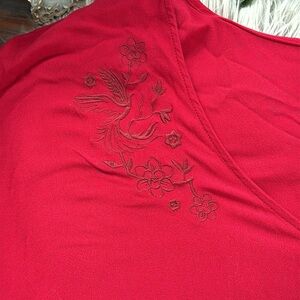 Elegant red blouse with button-down front. Features delicate embroidery on the shoulders. Perfect for casual or formal wear.