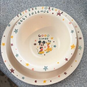 Charming Disney dinnerware set. Features beloved characters. Includes plate, bowl, and cup. Perfect for fans.