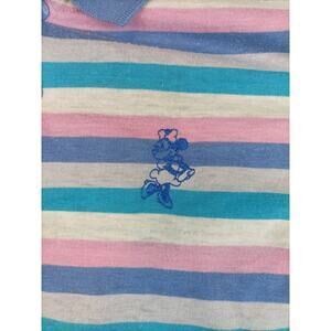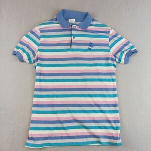 Colorful striped polo with short sleeves. Features embroidered character on chest. Comfortable and stylish.