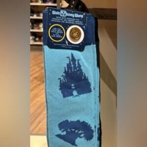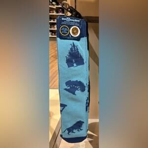 These park icon socks come with a removable Walt Disney World logo pin.The socks are light blue with dark blue toes and ankles. Walt Disney World park icons, like Cinderella Castle and the Tree of Life, are in dark blue across the socks.The pin at the top of the socks looks like a gold coin with the Walt Disney World Mickey globe “D” logo embossed in the center.