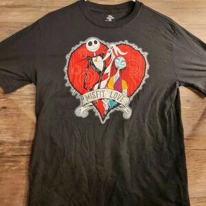 Features Jack and Sally graphic. Heart design with 'Misfit Love' banner. Comfortable short sleeves.