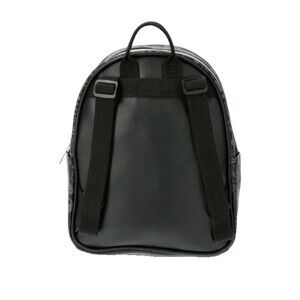 • Backpack: One main compartment and a front coffin-shaped pocket.; zipper closure at main compartment and front pocket with a Jack dangle on front pocket; adjustable PP Web shoulder straps: Top handle; smooth PU with inkjet repeat print and applique with foam backing; smooth PU piping on back and bottom; direct printed patent PU applique with foam backing; metal stud detail; epoxy metal zipper pull.