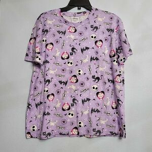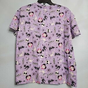 This is a new or gently used, women's short-sleeve T-shirt featuring a fun, all-over print inspired by Disney's The Nightmare Before Christmas. The pattern includes characters like Jack Skellington, Sally, Zero the ghost dog, and black cats, along with other spooky motifs like bats and skulls. The shirt is a light purple or lavender color, perfect for Halloween or any fan of the movie.