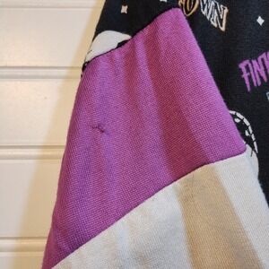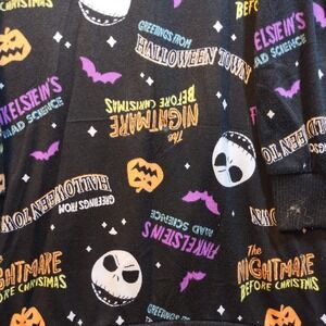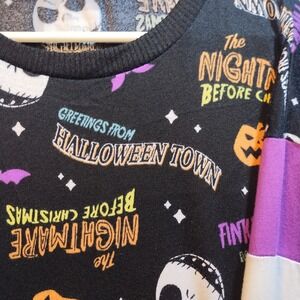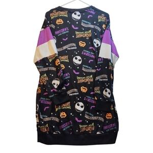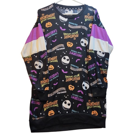Eye-catching nightgown with characters and elements from Disney's "The Nightmare Before Christmas". This black nightgown showcases a vibrant all-over print including Jack Skellington, pumpkins, bats, and phrases like "Greetings from Halloween Town" and "Finkelstein's Mad Science". The design also includes color-blocked long sleeves with purple and white sections. The nightgown has a classic crew neckline and ribbed cuffs, along with an overall relaxed fit.