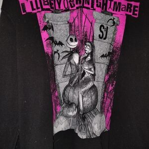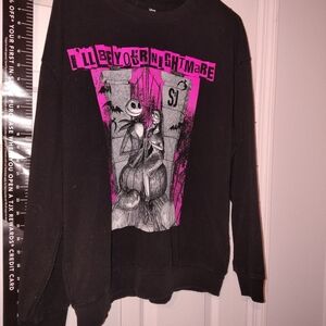 Black sweatshirt featuring a pink and gray Nightmare Before Christmas design.